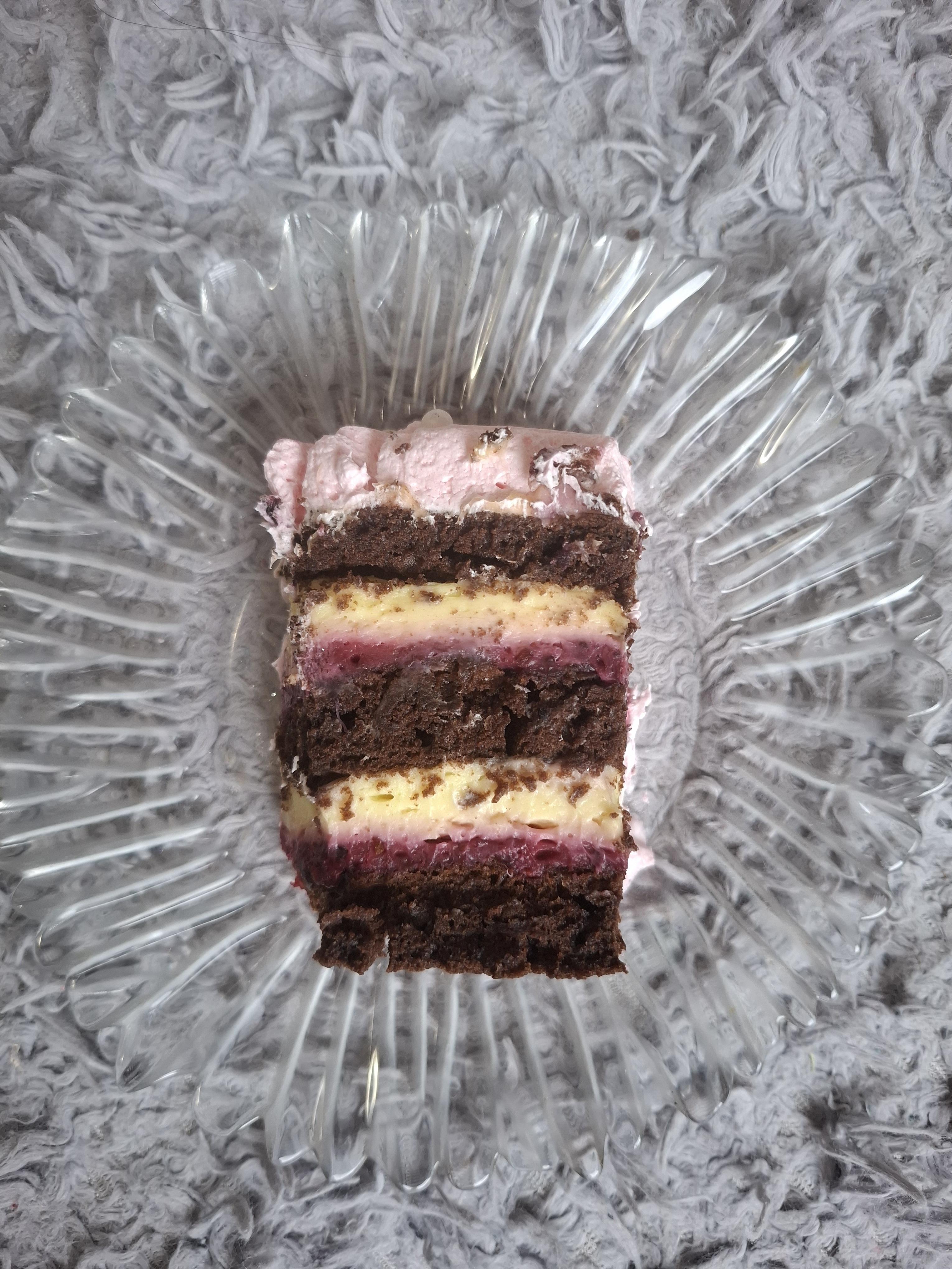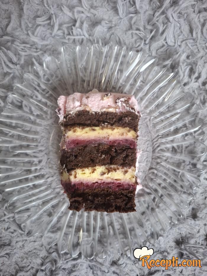 Filovanje: Na tacnu stavite patišpanj, premažite polovinom voćnog fila, a preko njega polovinu vanila fila. Zatim drugi patišpanj, voćni fil, vanila fil i treći patišpanj.