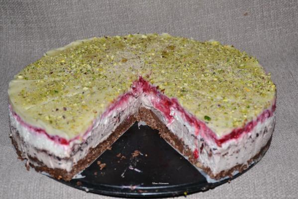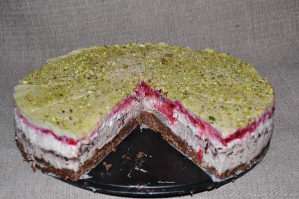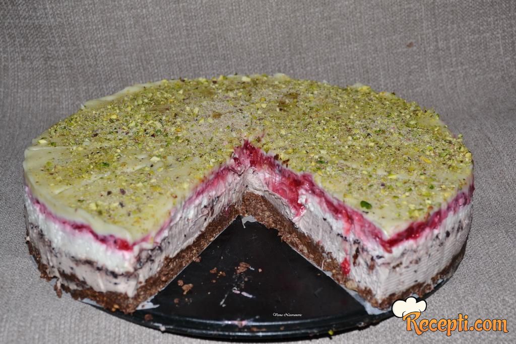 Na internetu sam naišla na recept Snežna torta i sačuvala sam ga. Što sam ga više čitala to sam dobijala sve bolje ideje kako da napravim ovu tortu. Imam predivne recepte za lagane podloge za cheescake te sam odlučila da jednu od njih iskoristim za izradu ove torte. U prodavnici zdrave hrane sam naišla na džem od šumskih kupina koji sam odmah kupila za moj cheescake. I tako malo po malo odstupila sam od orginalnog recepta 100%, ali je u svakom slučaju bilo dobro idejno rešenje, a svi su prijatelji pohvalili moj cheescake. U podlogu sam dodala 50 g pistaćija i 50 g pinjola, a u svakom slučaju svako može dodati orašaste plodove koje voli.