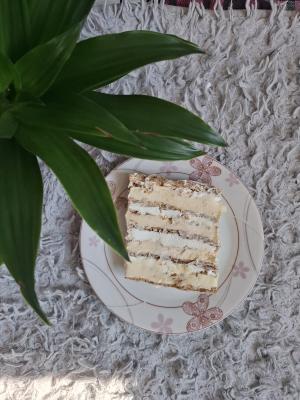 Koru prvo premažite poslastičarskim kremom, pospite mlevenim lešnicima, premažite smesom od slatke pavlake i krem sira. Isto ponovite sa ostalim korama.