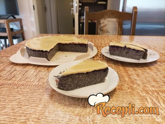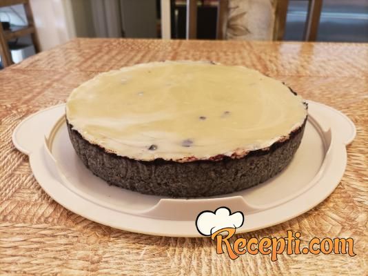 Sloj sa borovnicama: U manju šerpicu staviti borovnice (zamrznute borovnice prethodno odmrznuti i ocediti), dodati šećer i vanilin šećer. Staviti šerpicu na šporet i kuvati borovnice na srednjoj temperaturi uz stalno mešanje, sve dok se ne dobije struktura slična džemu (to je oko pet minuta, od momenta ključanja). Voćni fil malo prohladiti i sipati ga preko torte, pa ga kašikom ravnomerno rasporediti po celoj površini torte. Ostaviti da se ohladi na sobnoj temperaturi.