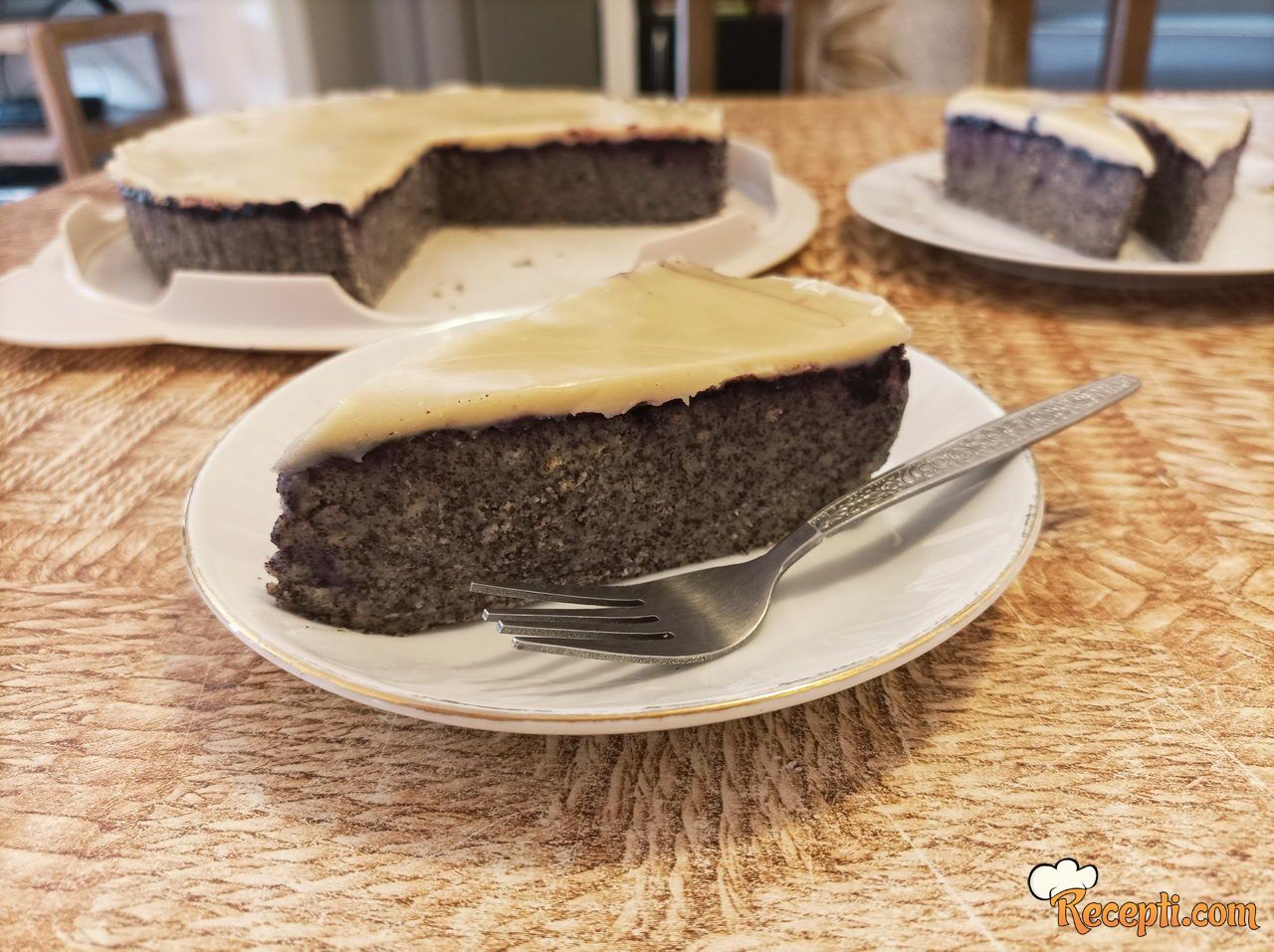 U dublju šerpu sipati mleko (koristila sam mleko sa ukusom badema), dodati šećer, griz i mleveni mak. Sve dobro promešati i staviti da se kuva na srednjoj temperaturi, uz stalno mešanje, sve dok se fil ne zgusne (to je oko 5 minuta). Skloniti šerpu sa šporeta, dodati iseckani i omekšali margarin i mešati sve dok se margarin ne otopi. Na kraju dodati mleveni keks i mešenjem ga dobro umešati u ostale sastojke. Smesu kašikom rasporediti unutar kalupa i lopaticom za torte je dobro ispretiskati. Sa lopaticom poravnati i površinu. Ostaviti da se hladi na sobnoj temperaturi dok se pravi voćni fil.