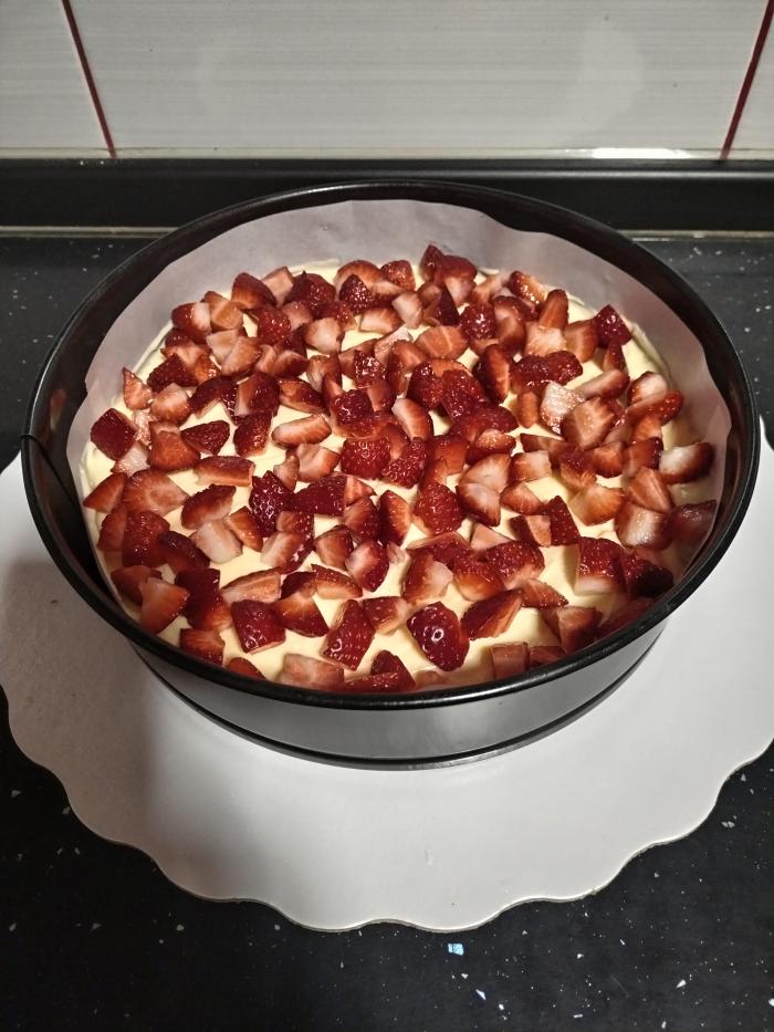 Preko poređajte polovinu pripremljenih jagoda isečenih na kockice.