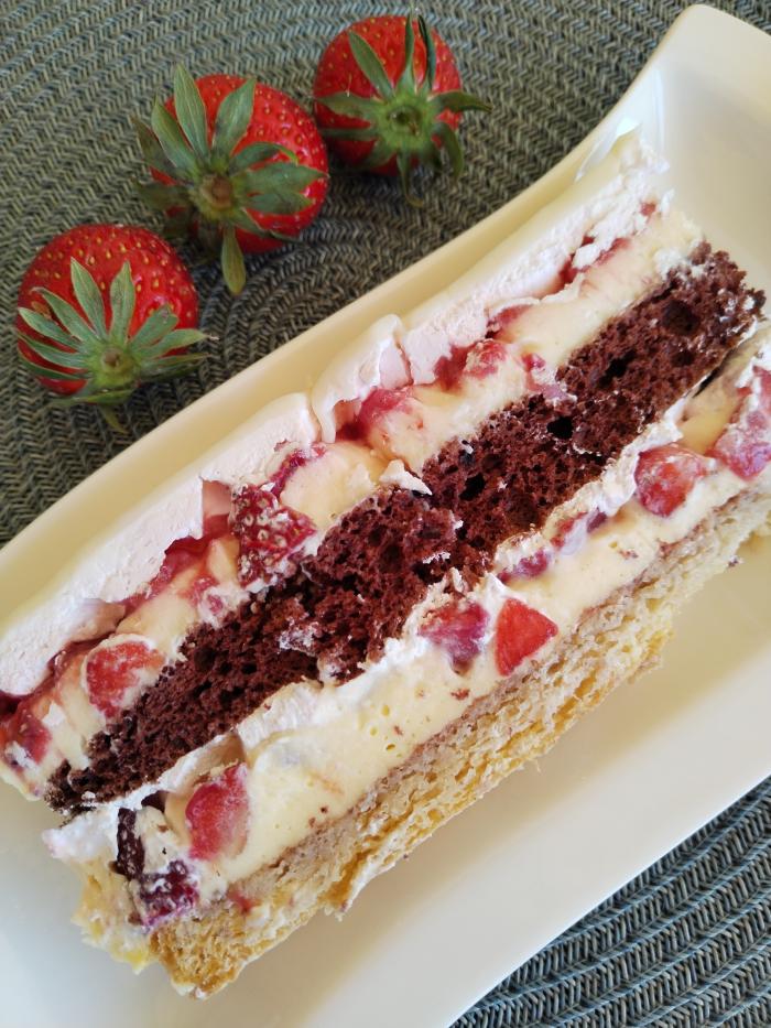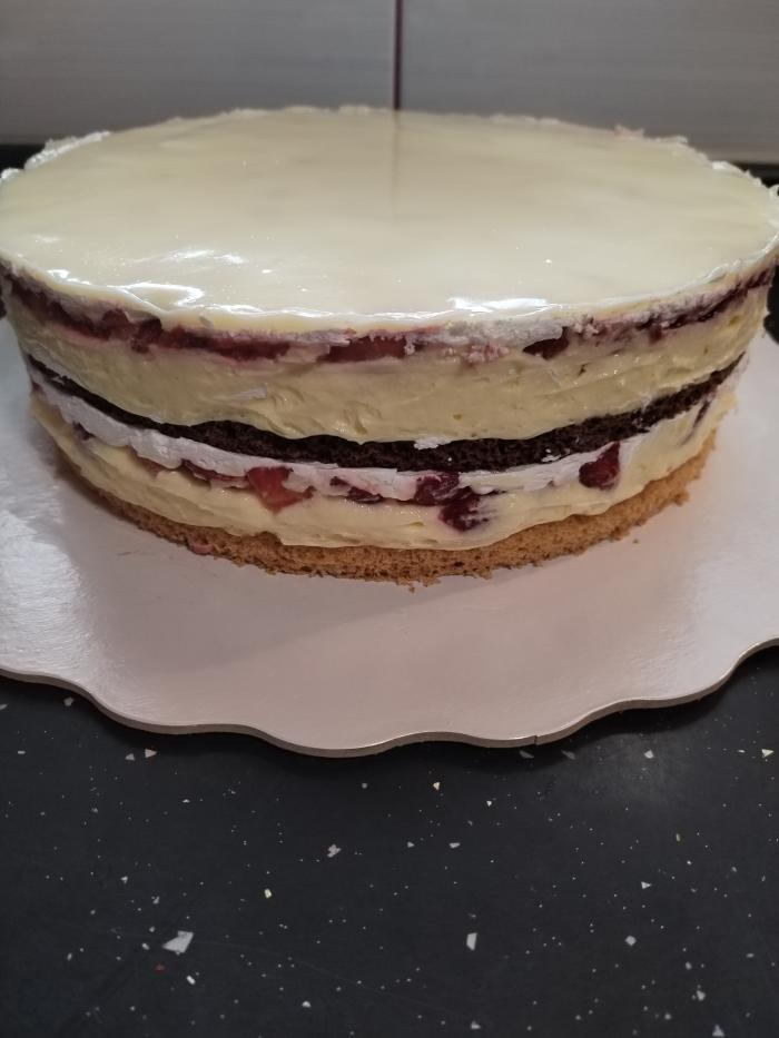 Odozgo stavite tamnu koru.I nju premažite sa malo toplog mleka pa preko stavite ostatak žute kreme. Preko toga stavite sloj izblendiranih jagoda, pa zatim jagode isečene na kockice.