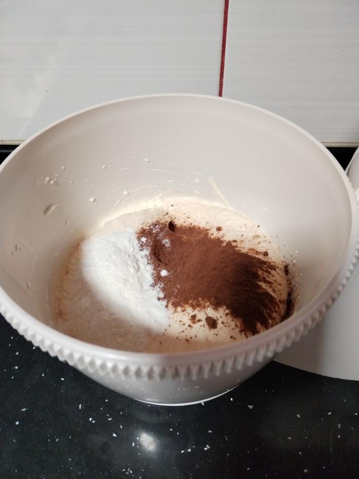 Za tamnu koru razdvojte belanca i žumanca pa belanca penasto umutite sa šećerom. Zatim dodajte jedno po jedno žumance i dalje muteći. Brašno pomešajte sa praškom za pecivo, pa polako umešajte u prethodnu smesu mešajući varjačom. Dodajte kakao pa dobro sjedinite. Smesu izlijte u okrugli pleh obložen papirom za pečenje.