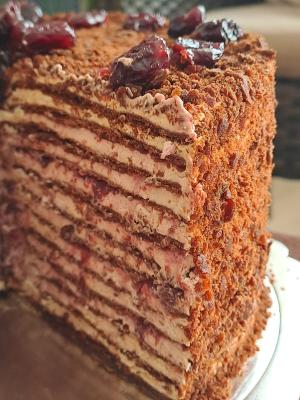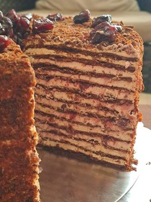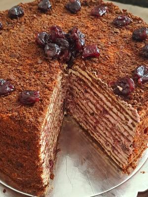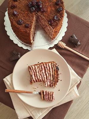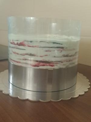Slaganje torte: Beli fil podelite na 11 delova, a fil od višanja na deset. Na tacnu za tortu nanesite na sredinu malo belog fila, koliko da se prva kora zalepi i fiksira. Stavite obruč za tortu, a zatim i acetatnu foliju. Ja sam razmereni deo belog fila sipala u dresir kesu i njom nanosila ravnomerno po kori, a zatim samo malo poravnala. Preko stavite deo fila sa višnjama. Onda stavite koru, blago pritisnite, pa nastavite sa korama i filovima naizmenično dok ne stignete do poslednje kore. Na nju nanosite samo beli fil.