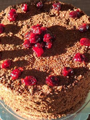U šerpicu stavite margarin i šećer i otapajte na laganoj vatri. Zatim dodajte oceđene višnje i kuvajte desetak minuta dok voda od višanja ne ispari i dok se šećer ne zgusne. Zatim dekorišite tortu odozgo i sa strane mrvicama samlevene kore, a odozgo poređajte i višnje.
