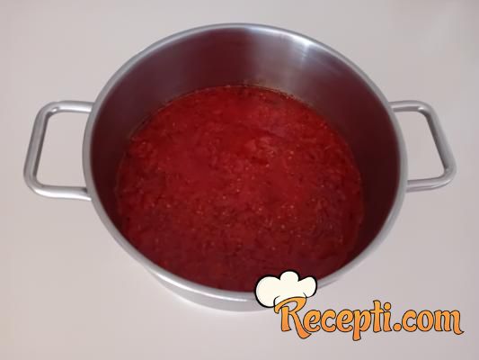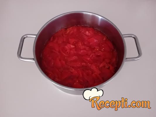 Paradajz oprati, zarezati oštrim nožem unakrst, staviti u odgovarajuću posudu i preliti vrelom vodom. Ostaviti da odstoji desetak minuta. Zatim paradajz preručiti u šerpu sa hladnom vodom i ostaviti da odstoji 5 minuta te paradajz oljuštiti i iseći na kockice. Ulje sipati u šerpu, dodati seckan paradajz i dinstati desetak minuta.