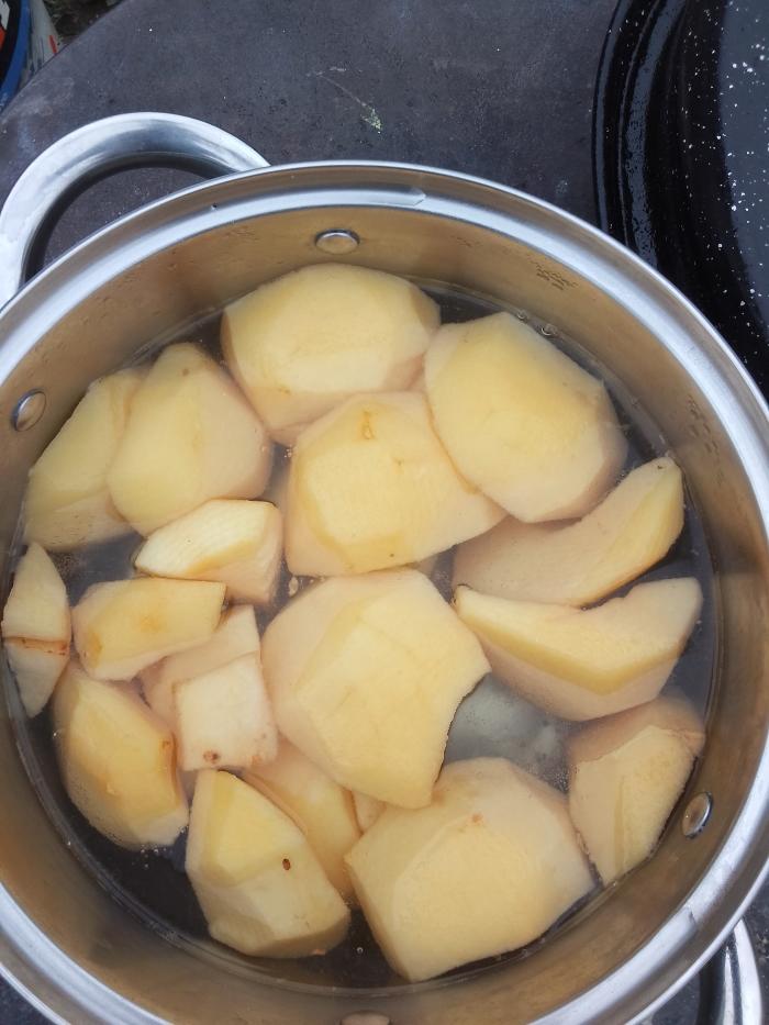 Dunje oljuštiti, oprati i iseckati na komade, stavljati ih direktno u dva litra vode, da ne bi potamnele. Staviti dunje na šporet da se kuvaju, dvadeset minuta od početka vrenja. Da omekšaju.