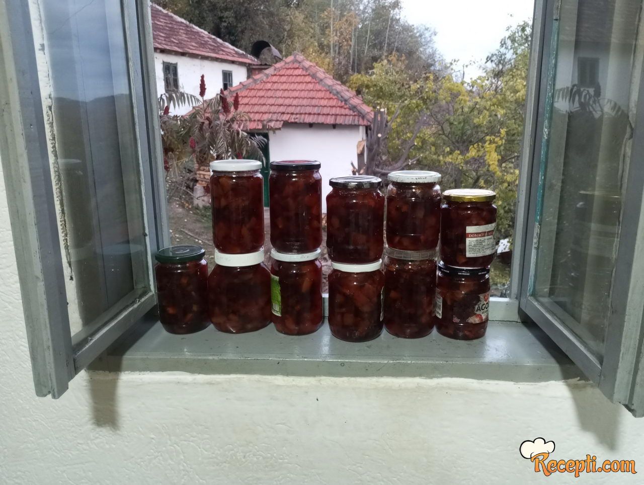 Punjenje tegli. Vruće slatko sipati u tople, sterilne tegle. Odmah zatvori i obrnuti ih naopako na 5 minuta, zatim ih vrati uspravno i ostavi da se ohlade.