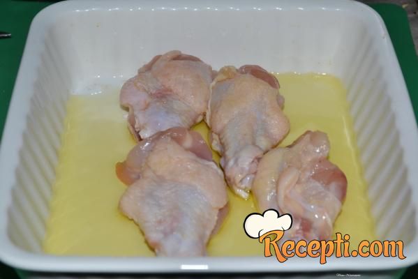 Tako pripremljene batake staviti u rernu. Rernu uključiti na 180 stepeni i peći cca 25 minuta. Dok se piletina peče pripremiti ostale sastojke. Pirinač oprati i procediti.