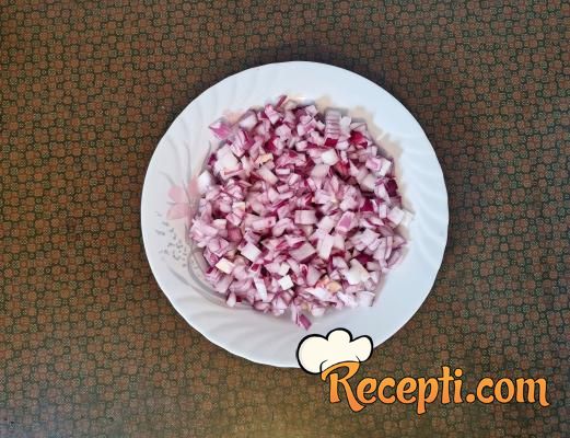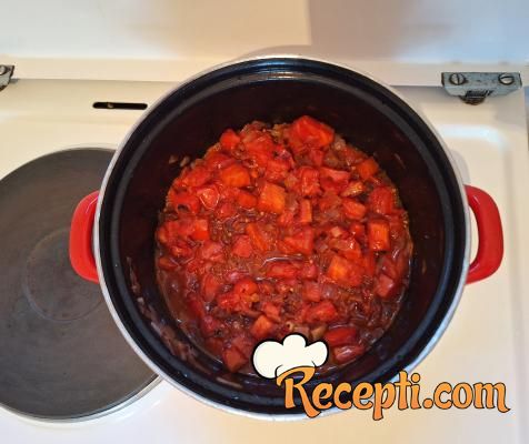 Na istom ulju izdinstati sitno iseckan crni luk. Dodati svež seckani paradajz na kockice ili paradajz pelat. Začiniti biberom, origanom, bosiljkom, posoliti, dodati cimet, loberov list i ostaviti da provri.