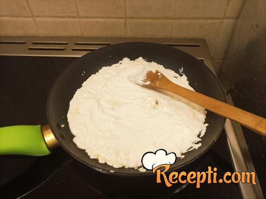 U masnoću gde su se pržile paprike ubaciti izmrvljeni sir i pržiti ga na tihoj temperaturi, uz mešanje, sve dok se sir potpuno ne otopi.