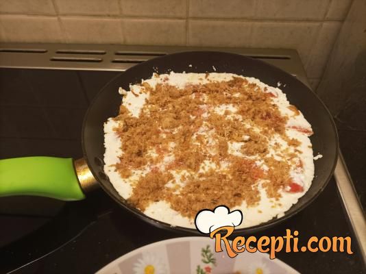 ...promešati i pažljivo razbiti dva jajeta na površinu. Poklopiti i pržiti dok se jaja ne stegnu koliko vi želite. Ja nisam koristila ni so ni biber, vi uradite po svom ukusu.