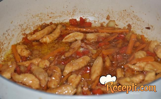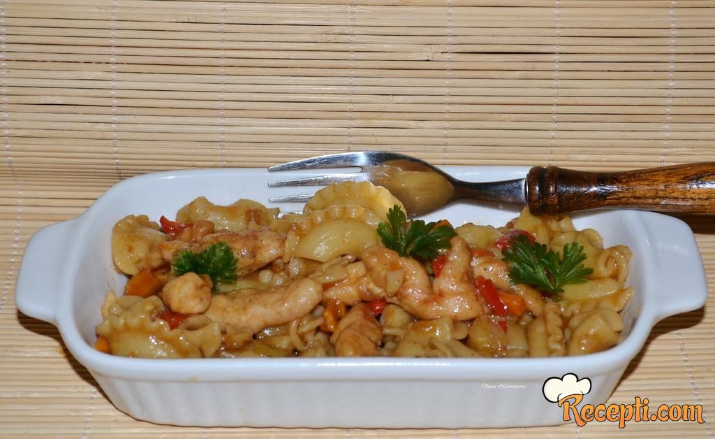 Danas sam odlučila da za ručak napravim piletinu sa testeninom po idejnom receptu "Pileći čau mein rezanci" – visokoproteinski obrok. Kako retko pripremam jela sa testeninom kod kuće nemam mnogo testenine i uvek prvo, pre nego odlučim da kupim neku testeninu potrošim testeninu koju imam kod kuće. Ovo je stvarno veoma ukusan ručak. I primenila sam neke nova saznanja dobijena gledajući kulinarske šoove sa profesionalnim kuvarima,, korušćenje škrobne vode od kuvanja rezanaca za podlevanje.