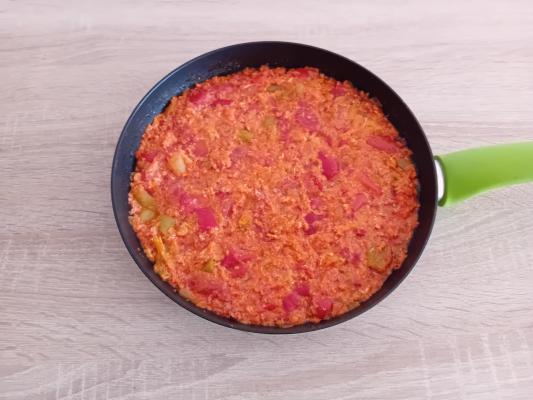 Paradajz zaseći unakrst, staviti u šerpu, preliti vrelom vodom i ostaviti da odatoji 5 minuta. Za to vreme oprati crvenu i zelenu papriku, kao i baburu i naseckati ih. Paradajz preručiti u drugu posudu, preliti hladnom vodom i ostaviti da odstoji par minuta te oljuštiti. Paradajz iseckati. Ulje usuti u tiganj/šerpu, zagrejati, dodati seckan crni luk, seckani beli deo praziluka te propržiti. Dodati seckane paprike i ukrčkati koliko da omekšaju. Zatim dodati šećer, suvi biljni začin, zatim biber, slatku začinsku papriku i izmešati. Dodati seckan paradajz,p osoliti po ukusu, izmešati, poklopiti i ukrčkati dvadesetak minuta. Jaja razmutiti viljuškom, postepeno dodavati u uprženo povrće, sve vreme mešati i ukrčkati 5 minuta. Skloniti sa ringle i poslužiti.