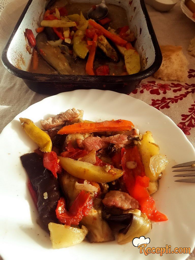 Svo povrće operite, očistite, isecite na krupnije komade i stavite u odgovarajući sud za pečenje. Dodajte meso isečeno na manje komade, pa i njega stavite u sud preko povrća. Sve posolite, pobiberite i začinite suvim začinom pa izmešajte. Prelijte uljem, pokrijte papirom za pečenje koji ste pokvasili vodom i stavite u rernu da se peče na 200 stepeni, oko 15 minuta, a zatim sklonite papir i pecite još 15 minuta. Jelo poslužite toplo.
