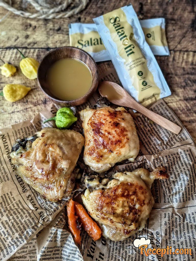 U činiju staviti piletinu, posoliti i dodati suvi biljni začin, pa sve utrljati rukama. Ostaviti da odstoji oko pola sata. Na zagrejanom ulju ili masti dinstati batake na tihoj vatri, uz povremeno dolivanje malo vode. Kada porumene i budu mekani, skloniti sa vatre i poslužiti uz krompir, salatu ili povrće po želji.