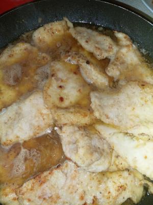 Meso iseći tanko. Soliti i posuti biberom. Uvaljati u brašno. Popržiti na ulju sa obe strane samo da promeni boju. Izvaditi iz tignja.