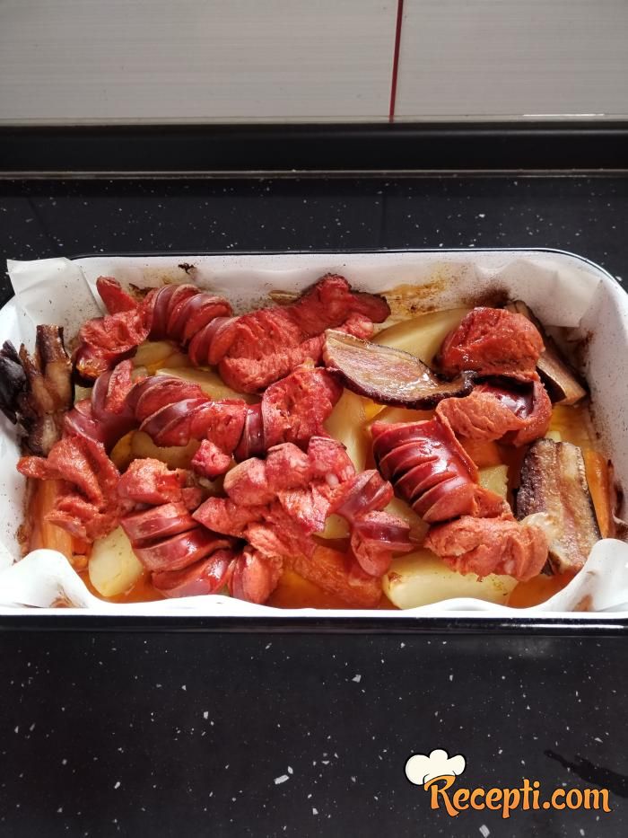 U đuveč pleh stavite papir za pečenje pa preko njega razmažite mast. Kobasice zasecite na režnjeve širine oko 1,5-2 cm, pa ih poređajte u pleh. Krompir oljuštite i isecite na kriške, pa ga začinite po ukusu i poređajte oko kobasica. Šargarepe isecite na duguljastu parčad, pa je dodajte u pleh, a zatim dodajte i slaninu.