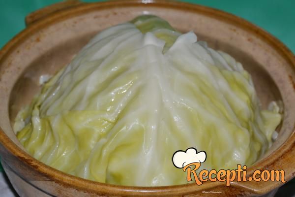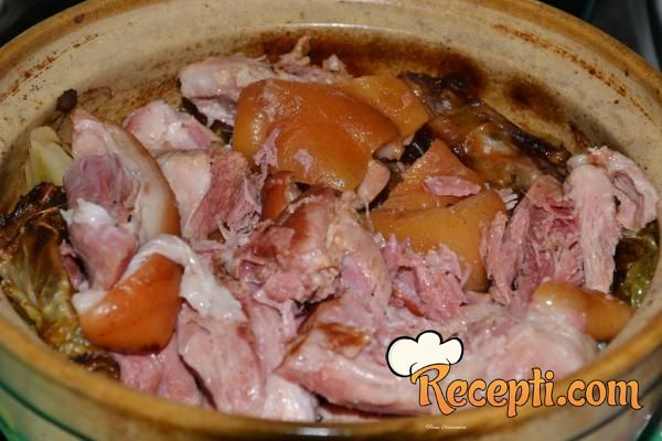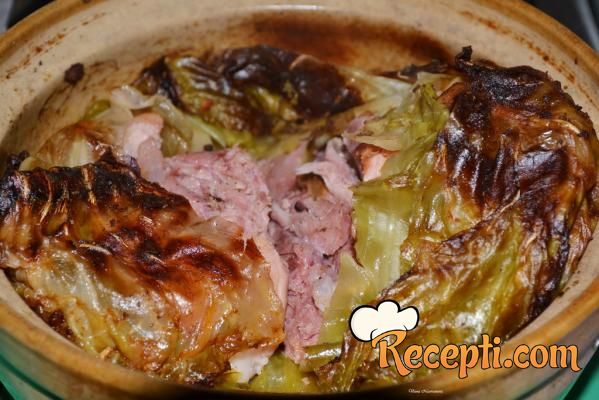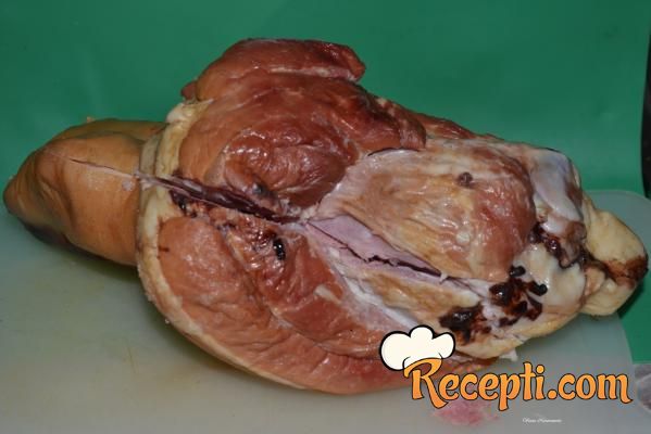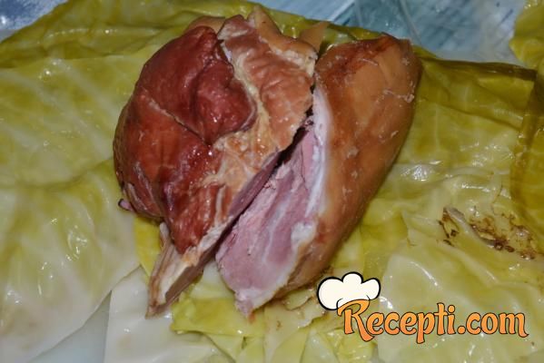 Na internetu sam naišla na recept Dimljena svinjska kolenica zamotana u kiseli kupus i pošto mi se jako sviđao recept dlučila sam da napravim. U dućanu nisam našla kolenicu nego barenu butkicu od 1,5 kg i odlučila sam da pošto je velika i dugačka oslobodim meso od kostiju i tako pripremam da mi stane u normalnu posudu i da ne dobijem preveliku količinu. Naišla sam na pakovanje kiselog kupusa u listovima, tako da sam jedan deo usitnila, a 5 najvećih listova sam koristila za uvijanje butkice (ostatak sam stavila u zamrzivač).