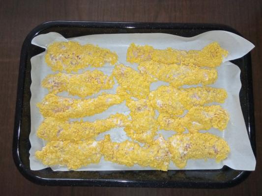 Kornifleks izmrviti, ne previše sitno, da ostanu malo krupniji komadići. Šnite piletine, vaditi iz pripremljenog poha, i uvaljati sa svih strana u kornifleks.