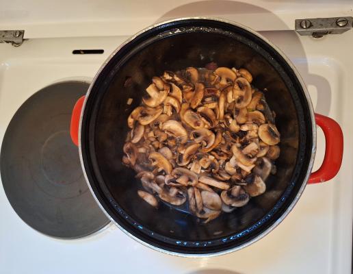 Na istom ulju propržiti seckani crni i beli luk, pa dodati šampinjone isečene na listiće.