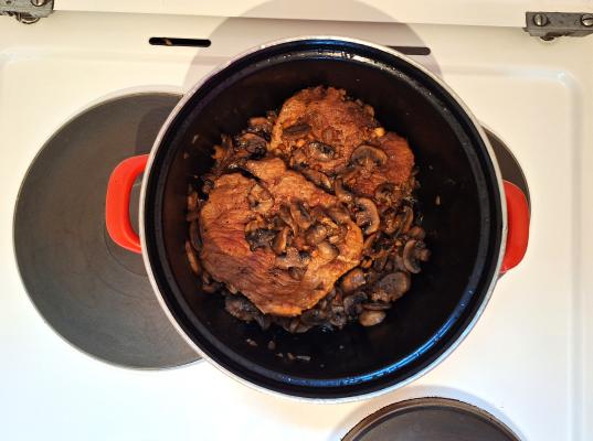 Dodati suvi biljni začin, beber, so i dinstati dok ne ispari višak vode koje su pečurke pustile. Naliti 100 ml vode, dodati svinjske šnicle i kikiriki.