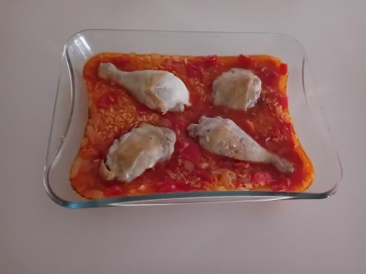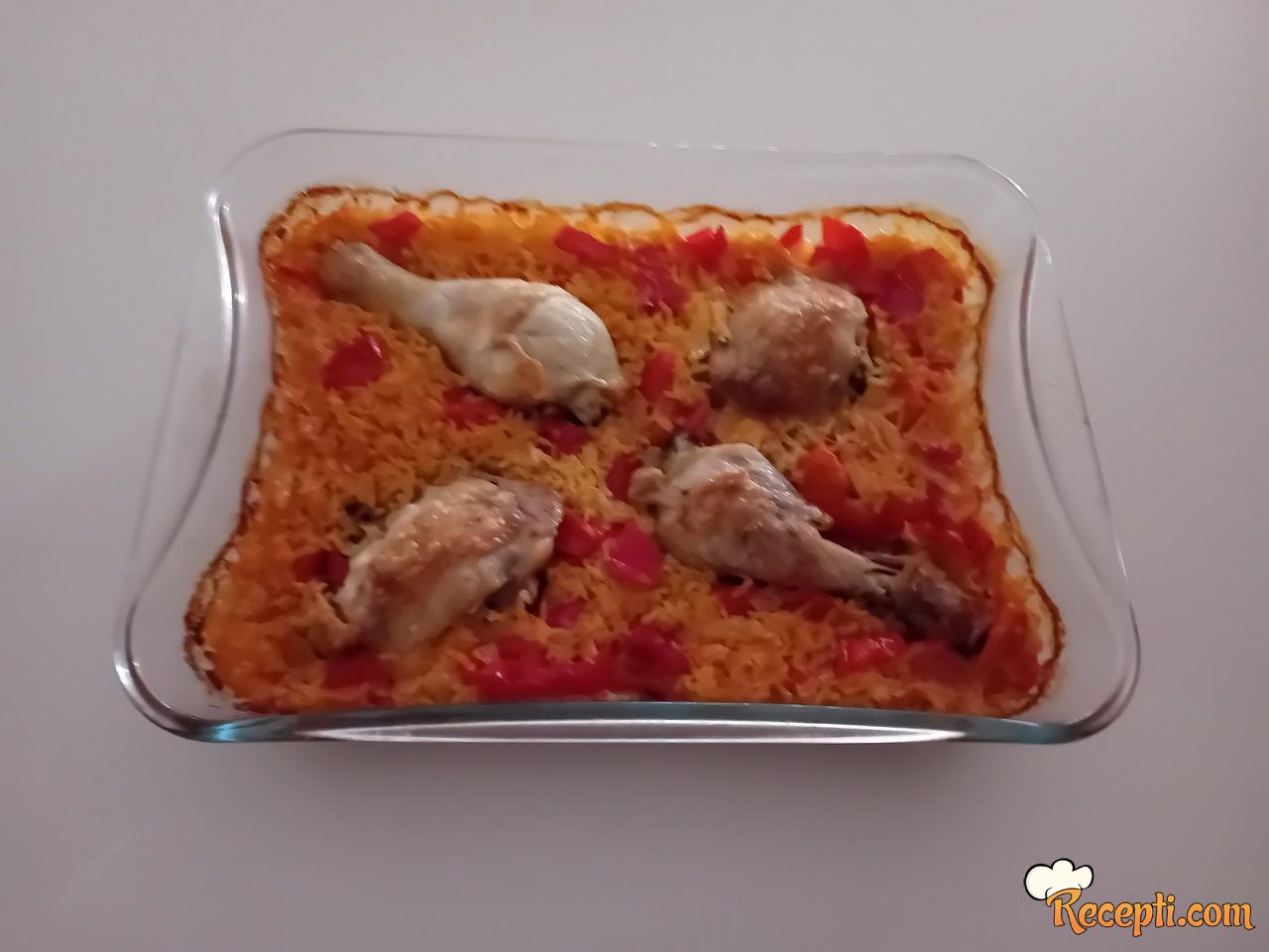 Na zagrejanom ulju kratko propržiti batake i karabatake (sa obe strane) te ih odložiti na tanjir. Na istoj masnoći propržiti sitno seckan crni luk, dodati na kolutove seckanu šargarepu, umešati pirinač, seckanu papriku i kratko propržiti. Zatim posoliti po ukusu, umešati biber, suvi biljni začin, slatku začinsku papriku, izmešati, sipati vodu i ponovo izmešati kako bi se svi sastojci sjedinili. Preručiti u vatrostalnu posudu. Poređati batake i karabatake i staviti u rernu da se peče. Peći na 200 stepeni oko 45 minuta (odnosno, dok pirinač ne omekša, a meso ne porumeni).