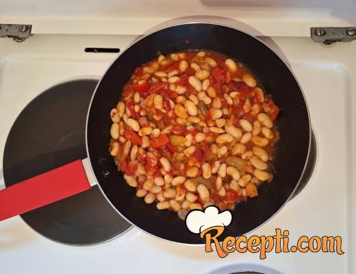 Sve promešati i naliti vodom u kojoj se pasulj kuvao tako da jedva pokrije pasulj. Pasulj začiniti i ostaviti da se krčka da se sjedine sastojci.