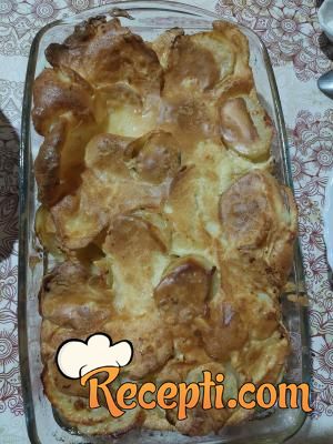 Jaje pomešati sa brašnom, mlekom i soli. Smesa je malo gušća nego za palačinke. Preliti preko krompira i vratiti u rernu još nekih 15 do 20 minuta.