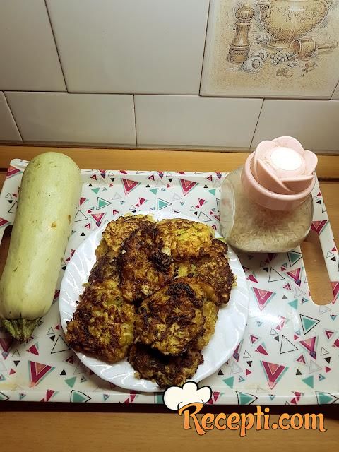 U sud stavite oceđenu tikvicu, dodajte skuvan pirinač, jaja, prašak za pecivo, suvi začin i mleveni biber i lagano izmešajte, a zatim dodajte brašna po potrebi, kako biste dobili smesu pogodnu za prženje. Sve dobro sjedinite pa vadite po punu kašiku smese i pržiti na zagrejanom ulju, dok ne porumene sa obe strane. Vadite ispržene šnicle i stavljajte na papirni ubrus.