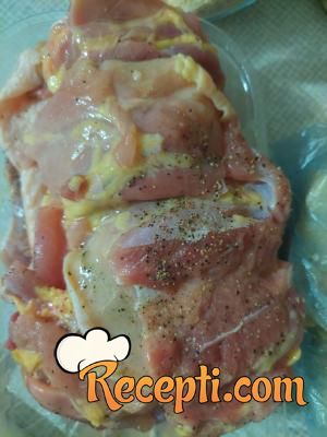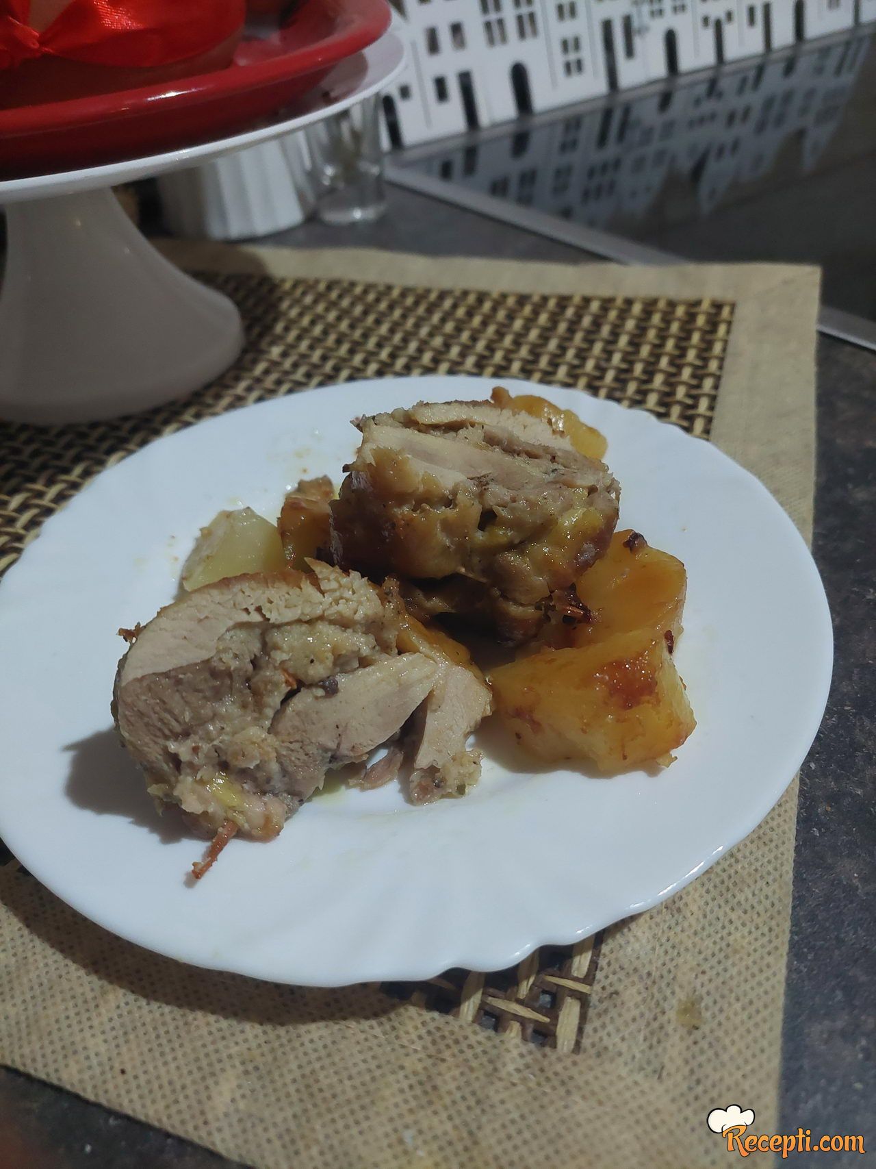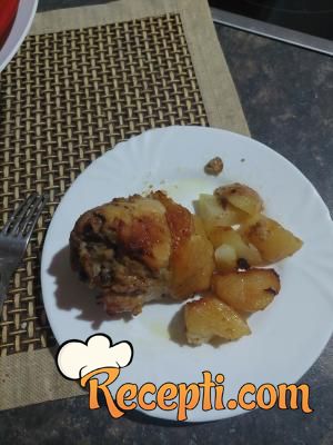 Peći meso na 200 stepeni oko sat i po. Pred kraj u vatrostalnu činiju ubaciti skuvani krompir. Zapeći još desetak minuta, ali bez folije.