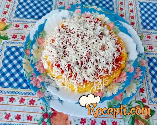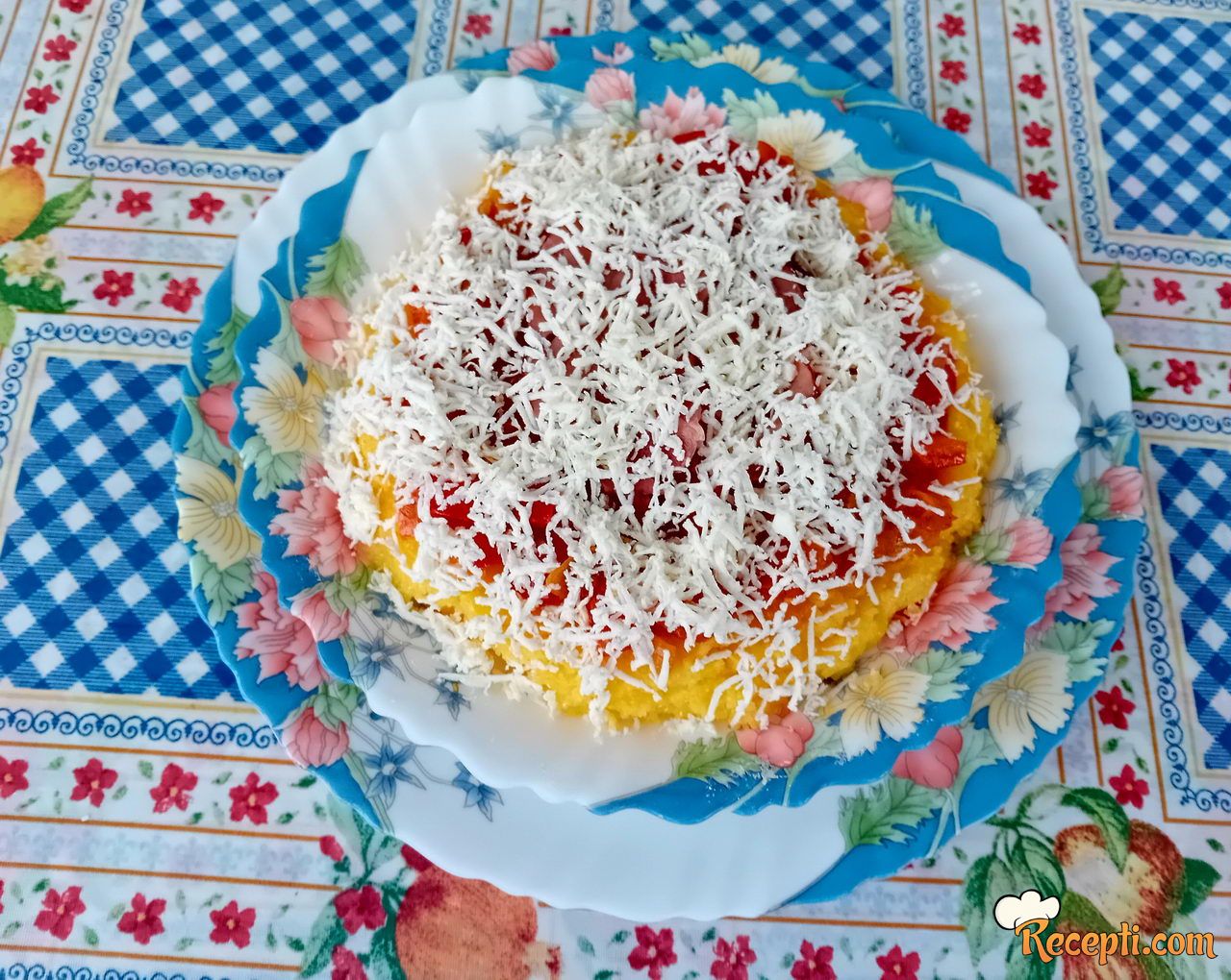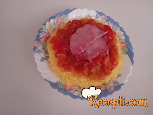 Na vrlo malo ulja propržiti tanko rezani suvi vrat,preručiti na tanjir i odložiti sa strane.U tiganj sipati još malo ulja,dodati sitno seckan crni luk i upržiti.Zatim dodati seckanu papriku,oljušten i seckan paradajz i začiniti po ukusu (dodati so,biber i suvi začin).Izmešati i pržiti dok povrće ne omekša,pa skloniti sa ringle.U šerpu sipati vodu,dodati so,mast i staviti na vatru da provri.Dodati 2 kašike palente,izmešati,umešati 50 g rendanog sira i preostalu palentu.Kuvati na umerenoj vatri sve vreme mešajući (bude brzo gotovo,za par minuta).U 2 tanjira rasporediti palentu.Zatim naneti povrće,pa preko poređati suvi vrat.