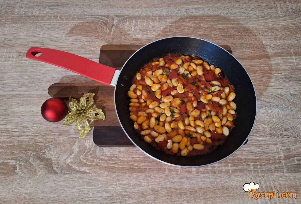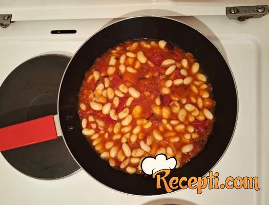 Dodati oceđen pasulj i sve promešati. Po želji naliti ostali paradajz sos. Pasulj začiniti i ostaviti da se krčka do željene gustine. Veoma ukusan posni pasulj služiti sa salatom po želji,