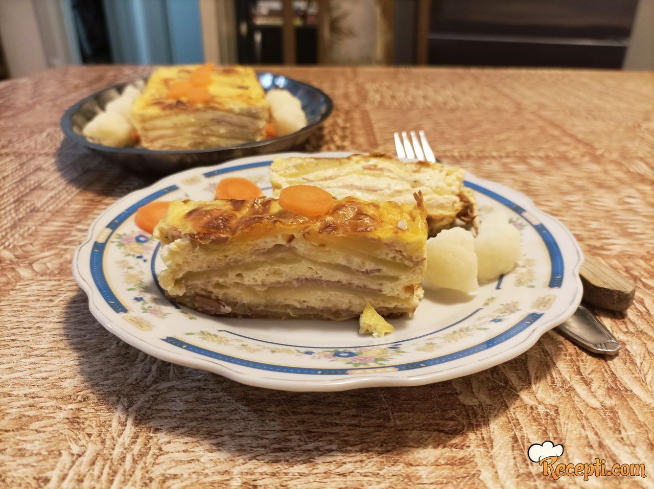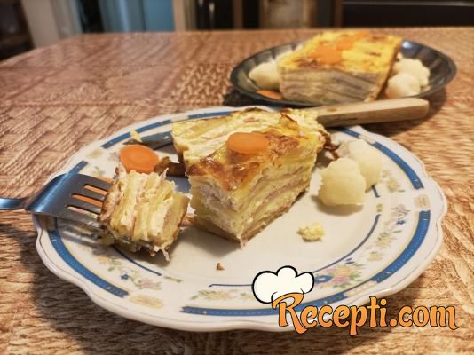 Preko krompira poređati tri tanka šnita dimljenog svinjskog vrata, pa preliti sa, oko, četiri kašike preliva sa sirom. Ponoviti postupak još tri puta, sve na isti način slaganja i prelivanjem kao i prvi put.