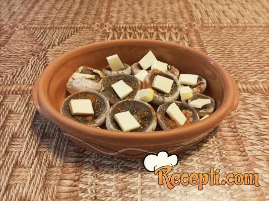 Pečurke oljuštiti (ne perite ih), izvaditi drške i poređati u odgovarajuću posudu. Pečurke posoliti sa solju, biberom i alevom paprikom po ukusu. U svaku pečurku staviti po komadić maslaca, a ostatak staviti između pečuraka. Staviti pečurke da se peku, u prethodno zagrejanu rernu, na 220 stepeni oko 18 minuta. Ako spremate u zemljanoj posudi, kao ja što sam radila, posudu stavite u hladnu rernu, pa je uključite (tako ćete sprečiti da vam posuda pukne).