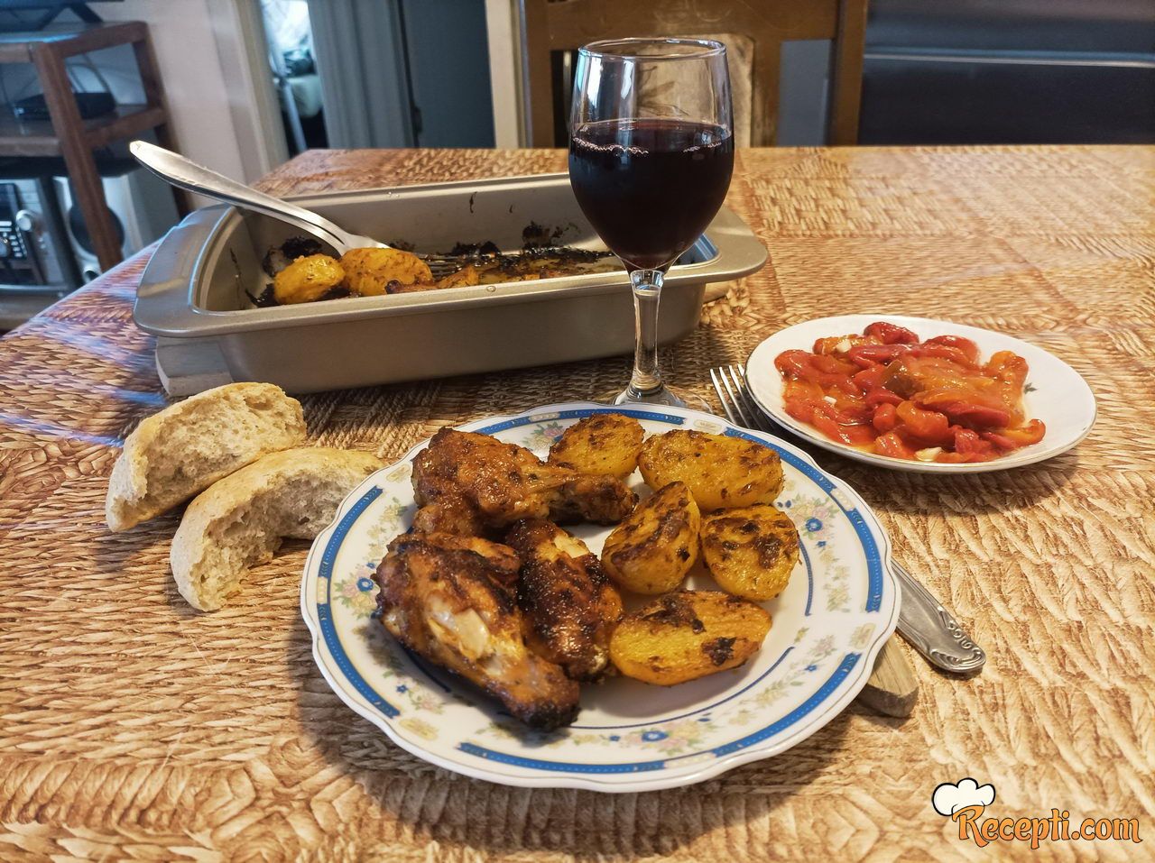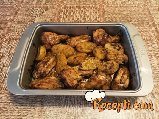 Izvaditi marinirano meso iz frižidera. Rernu uključiti da se zagreje na 200 stepeni. Krompir oljuštiti i iseći na polovine (ako su manji) ili na četvrtine (ako su veći). Odgovarajući pleh sa nelepljivim dnom (ili pleh prekriti pek papirom) samo malo premazati uljem. Poređati meso u pleh. Krompir ubaciti u posudu sa ostatkom marinade, dobro ih uvaljati u marinadu i poređati u pleh sa mesom. Krilca, batačiće i krompir samo malo poprskati sa uljem i staviti da se peku 45 minuta. Ako je potrebno, preokrenuti meso i vratiti da se zapeče (ja ga nisam preokretala, sve zavisi od šporeta). Poslužiti sa salatom po želji.