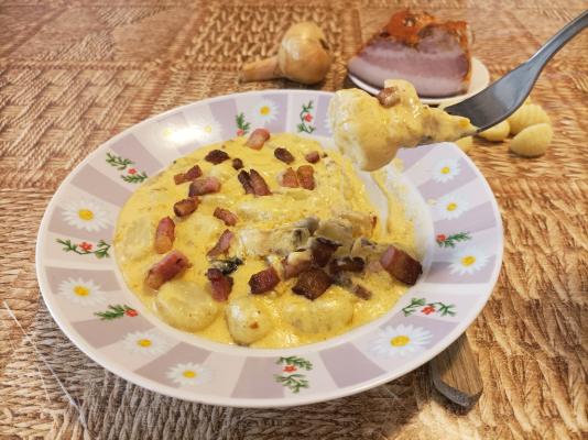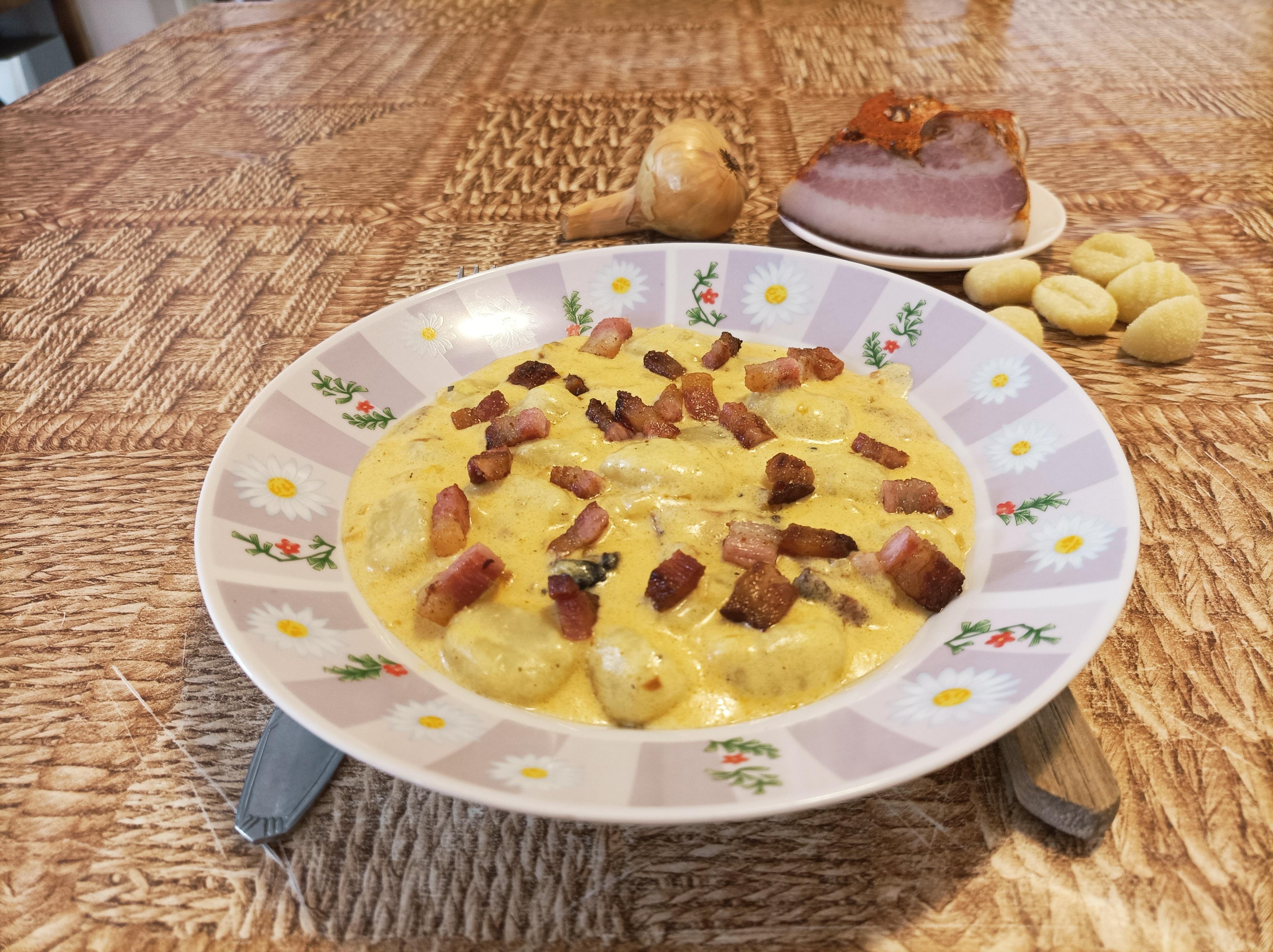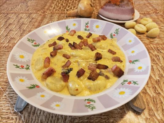 Slaninu iseći na male trake, a crni luk sitno iseckati. Dublji tiganj staviti da se zagreje na srednjoj temperaturi, pa sipati ulje i ubaciti slaninicu. Dok se slaninica prži skuvajte njoke po receptu sa pakovanja. Prženu slaninicu, rešetkastom kašikom, izvaditi na tacnu, a u masnoću ubaciti iseckani crni luk. Luk pržiti, uz češće mešanje, sve dok ne omekša. Dodati pavlaku za kuvanje i vodu u kojoj su se njoke kuvale. Promešati i ubaciti beli luk u prahu, mleveni biber i suvi biljni začin. Dobro promešati, pa dodati čedar sir koji je krupno narendan (možete dodati trapist, edamer, gaudu...). Mešati da se čedar sir otopi, pa vratiti prženu slaninicu (ostaviti malo i iseckajte da pospete po jelu kada ga sipate u tanjir), dodati proceđene njoke i sve dobro promešati. Skloniti sa vatre i poslužiti.