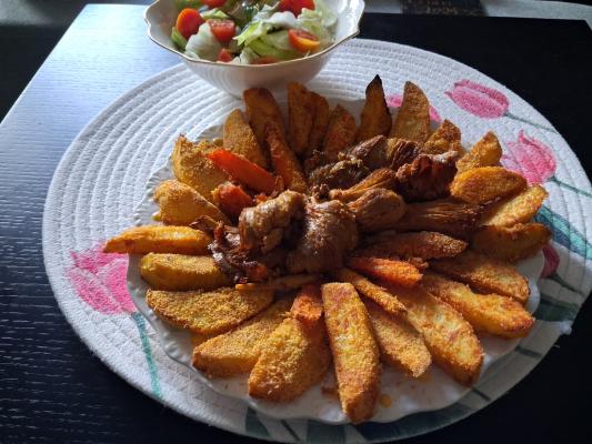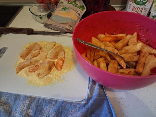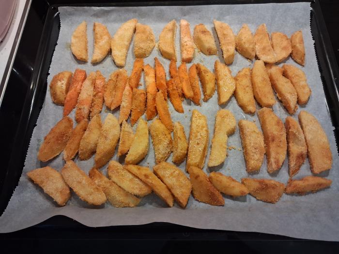 Očišćen i opran krompir i šargarepu iseći na kriške ili štapiće (ne preterano sitno). U iniji izmešati ulje sa začinima (paprika, biber i suvi biljni začin). Povrće ne treba brisati, već vlažno ubaciti u činiju sa začinima. Dobro izmešati da se sa svake strane nalepe začini. Na dasku staviti mešavinu palente i čvrstina i svaki komad uvaljati, pa ređati na pleh obložen pek paprirom.