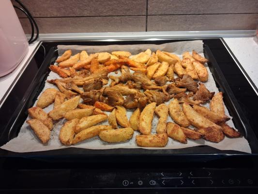 Polupečen krompir i šargarepu izvaditi iz rerne (vreme je otprilike + 10 minuta od momenta kada se rerna zagreje na 200 stepeni). Razmaknuti ih i dodati pečurke koje su takođe uvaljane u palentu i čvrstin. Vratiti pleh u rernu i peći još oko 10 minuta, odnosno dok krompir na ubod viljuškom ne bude sasvim mek.