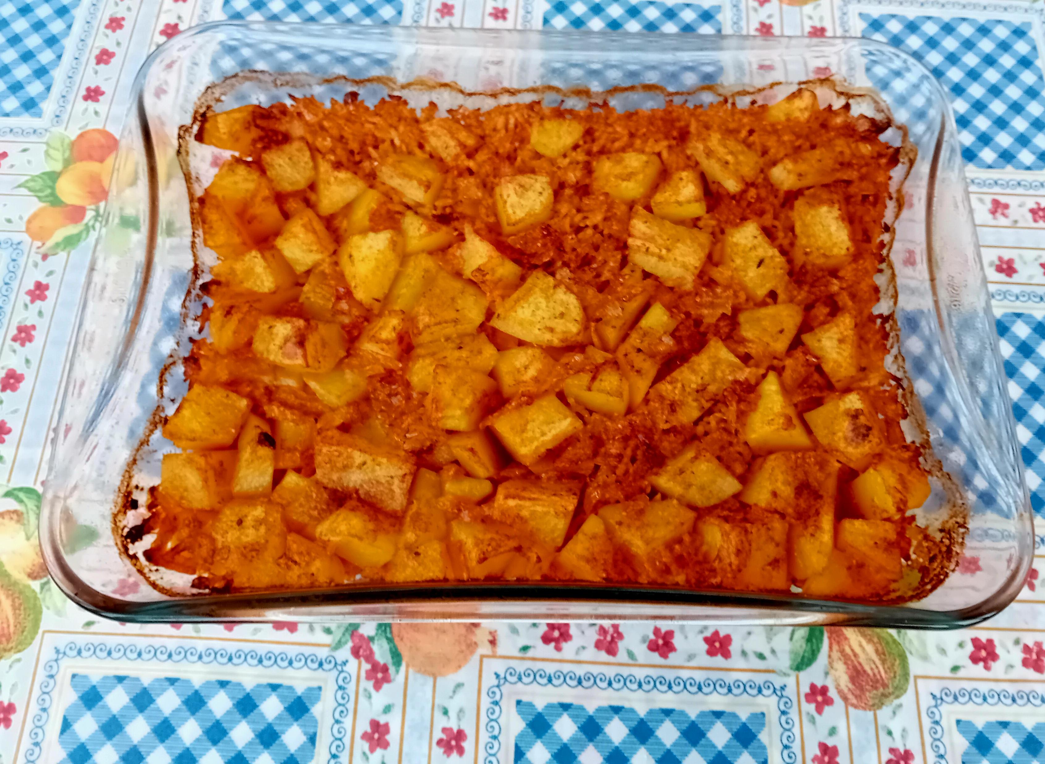 Krompir oljuštiti, oprati i iseći na kockice. Pirinač oprati i procediti. Na zagrejanom ulju propržiti sitno seckan crni luk, dodati seckan beli luk, kratko upržiti te umešati slatku začinsku papriku i izmešati. Zatim dodati krompir, pirinač i začiniti po ukusu (dodati so, biber i suvi biljni začin) te preručiti u vatrostalnu posudu/pekač i preliti toplom vodom da ogrezne. Peći u dobro zagrejanoj rerni na 190 stepeni 45 minuta.