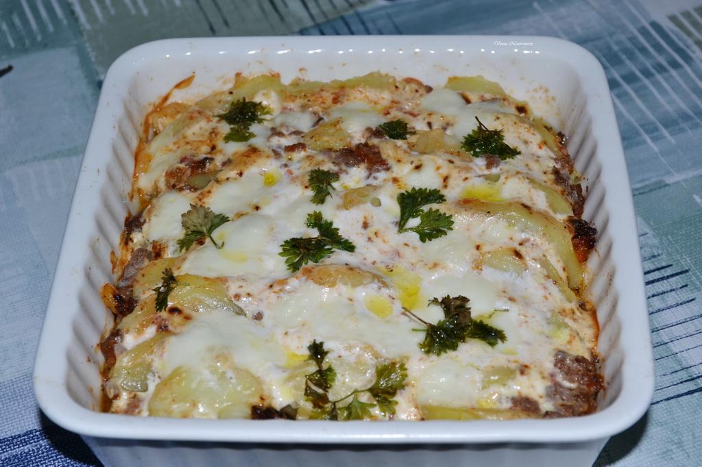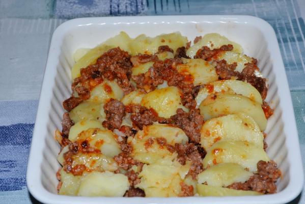 U vatrostalni sud 15 cm x 15 cm staviti malo maslinovog ulja te ređati malo ukoso krompir, mleveno meso pa opet krompir i tako redom dok se ne utroši sav materijal.