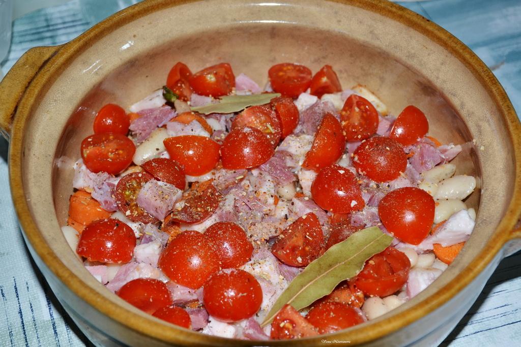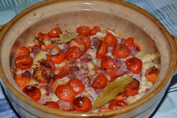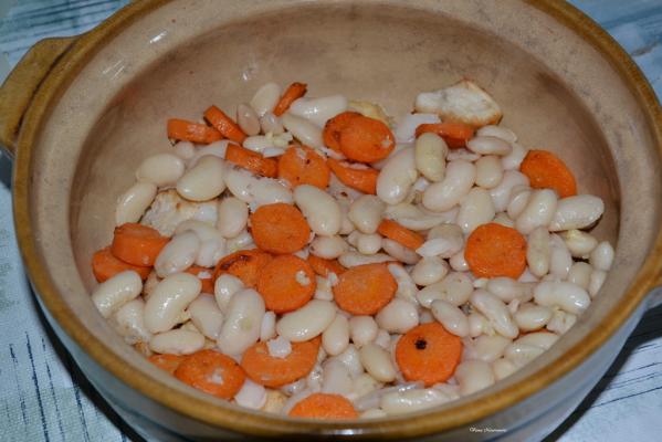 Nedavno sam kuvala "Pasulj sa piletinom" i pošto sam višak kuvanog pasulja stavila u zamrzivač odlučila sam da ga iskoristim za još jedno novo jelo koje sam našla na internetu "Zapečeni pasulj sa piletinom i paradajzom". Dodala sam šargarepu koja nije u receptu i malo korigovala količine sastojka i dobila izvanredan ručak.