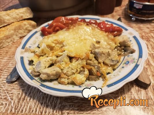 Odgovarajuću posudu sa nelepljivim dnom (koristila sam dublju posudu veličine 24 cm) samo malo premazati uljem i izručiti proprženo meso. Ravnomerno ga rasporedite. Posuti ga iseckanim peršunom, solju i biberom po ukusu. Preko mesa rasporediti pržene šampinjone. U isprženu šargarepu i crni luk dodati kiselu pavlako, promešati da se sve sjedini i premazati preko pečuraka. Preko obilno narendati kačkavalj i staviti u ,prethodno zagrejanu, rernu na 200 stepeni da se peče sve dok kačkavalj ne porumeni, oko 25-30 minuta. Poslužiti sa salatom po želji.