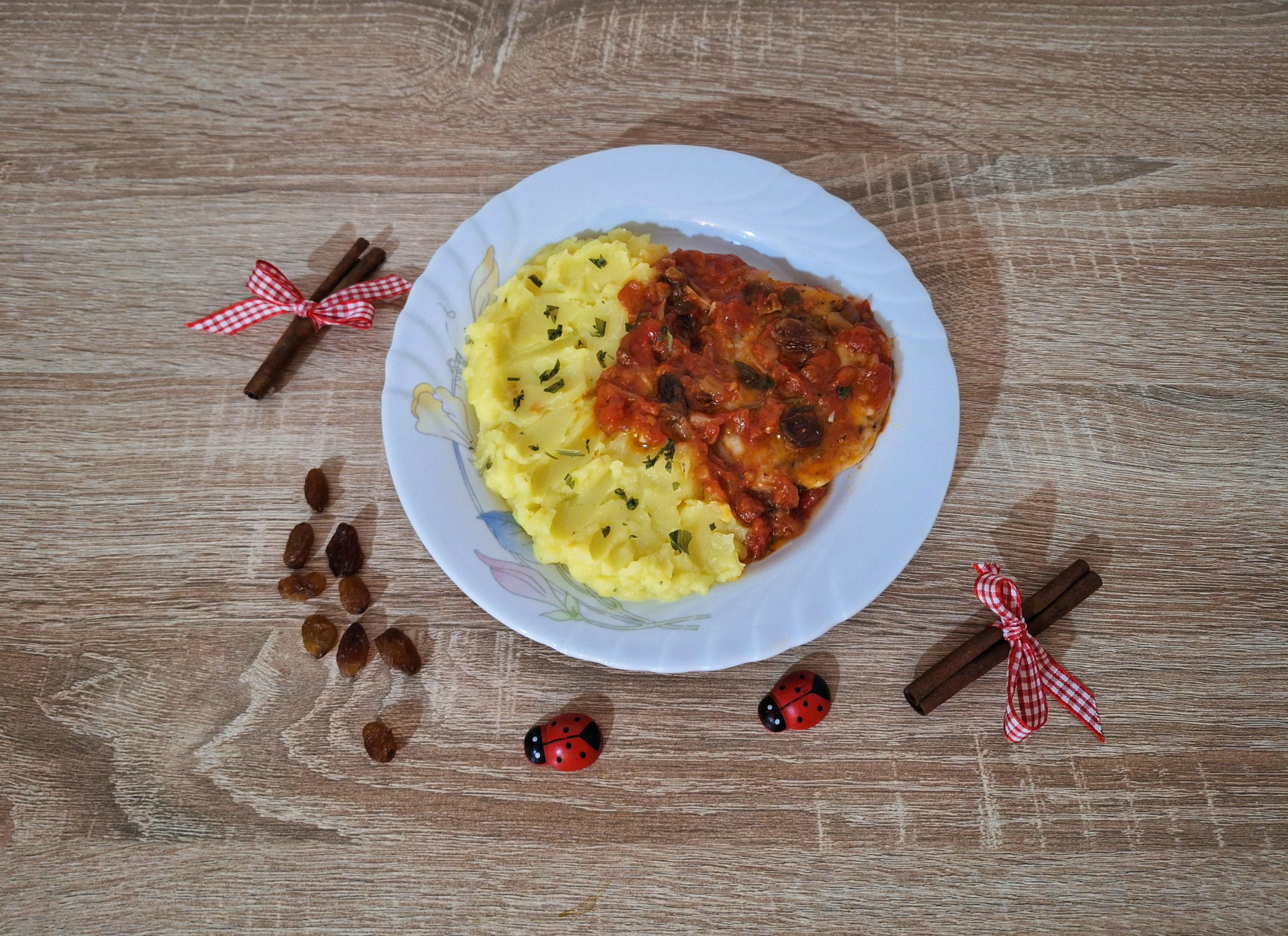 Paradajz sos prelepo miriše na cimet i suvo grožđe. Piletina je mekana i sočna, kada se prelije sa sosom dobije se prelep ukus. Ko ne voli suvo grožđe može da stavi vrlo malu količinu.