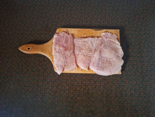 Šnicle posoliti i pobiberiti, izlupati tučkom za meso i uvaljati ih u brašno.
