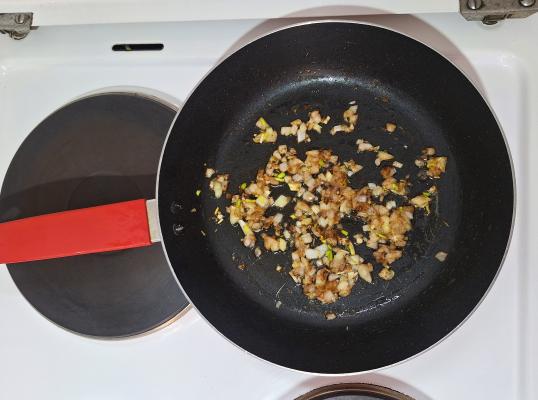 Odabrati dublji tiganj. U tiganj sipati malo maslinovo ulje i na srednjoj vatri zagrejati ulje. Dodati jednu kašičicu cimeta, kada zamiriše dodati sitno seckani crni luk i pržiti ga dok ne postane staklast. Posle par minuta dodati iseckani beli luk.
