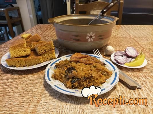 Zatim, pažljivo izvaditi posudu iz rerne, skloniti poklopac i vratiti da se kupus malo zapeče.