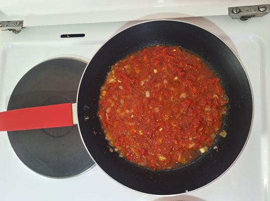 Naliti sok od paradajza i mešati oko tri minuta, pa kada smesa dobije lepu tamnocrvenu boju sipati crno vino. Kuvajti uz mešanje dok se smesa fino ne zgusne, pa sipati bujon od povrća.