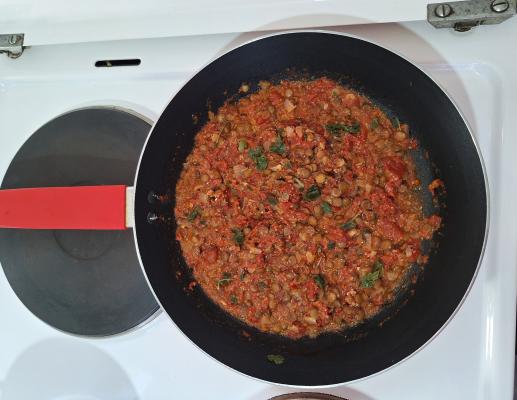 Dodati sočivo i mlevene orahe, pa mešati dok sos ne proključa. Smanjiti temperaturu pa krčkati uz mešanje još 20 minuta.